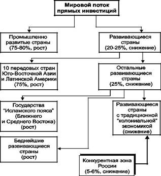 На фоне долгосрочных тенденций миграций международного капитала инвестиционное предложение в зоне конкурентного для России спроса является намного меньшим, чем потребность в иностранных инвестициях как российского ТЭК, так и страны в целом. Низкая притягательность России как объекта для производственных капиталовложений связана с диспропорциями в отраслевой, а значит и в страновой структуре мировых инвестиционных потоков, с одной стороны, и структурой экономики и экономического роста России, с другой. В настоящее время в России доминируют добывающие (сырьевые) отрасли, а также отрасли обрабатывающей промышленности при низкой доле передовых наукоемких отраслей и сферы услуг. А в отраслевой направленности прямых заграничных инвестиций на протяжении второй половины XX в. наблюдается последовательная переориентация с добывающей промышленности (50-е гг.) на обрабатывающую (60-70-е гг.), на сферу услуг (80-е гг.) и высокотехнологичные и наукоемкие отрасли (90-е гг.), на которые приходится свыше половины мирового годового потока новых вложений. Ориентация на сферу производственных услуг и высокие технологии обрабатывающей промышленности предопределила концентрацию зарубежных капиталовложений в зоне промышленно развитых стран (4/5 ежегодных потоков прямых инвестиций), являющихся одновременно крупнейшими импортерами и экспортерами капитала. Более половины ввозимого в развивающиеся страны капитала направляется в экономику нескольких наиболее развитых из них (Юго-Восточная Азия и Латинская Америка: Сингапура, Бразилии, Мексики, Китая, Гонконга, Малайзии, Египта, Аргентины, Таиланда, Колумбии). Перераспределение потока иностранных инвестиций в развивающиеся страны возможно за счет дальнейшей концентрации вложений в наиболее динамично развивающихся государствах Юго-Восточной Азии и Ближнего Востока. Для предотвращения глобальных социальных и военно-политических осложнений правительствам промышленно развитых государств придется поощрять привлечение частных прямых инвестиций также в политически нестабильные бедные и беднейшие страны. Таким образом, страны с традиционной “колониальной” структурой экономики (которые составляют конкурентную для России зону на мировом рынке капитала) будут представлять все меньший интерес для солидных иностранных инвесторов, преследующих долгосрочные цели - на их долю будет приходиться 5-6% мирового потока прямых инвестиций.
