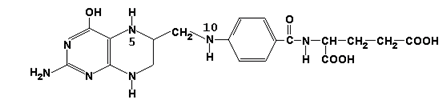 25.1.2.Реакционноспособными центрами в молекуле ТГФК являются атомы азота в положениях 5 и 10. Атомы водорода при N5 и N10 могут замещаться на различные одноуглеродные группы: метильную (-СН3), метиленовую (-СН2-), метенильную (=СН-), формильную (-СН=О) и некоторые другие. Основными источниками одноуглеродных групп в клетке служат серин и глицин.