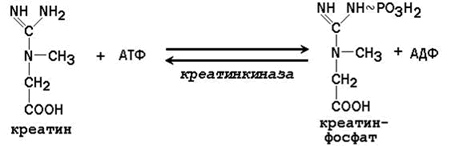 В состоянии покоя мышцы накапливают креатинфосфат (его содержание в неработающей мышце в 3-8 раз выше, чем содержание АТФ). При переходе к мышечной работе изменяется направление реакции и образуется АТФ, необходимый для мышечного сокращения.