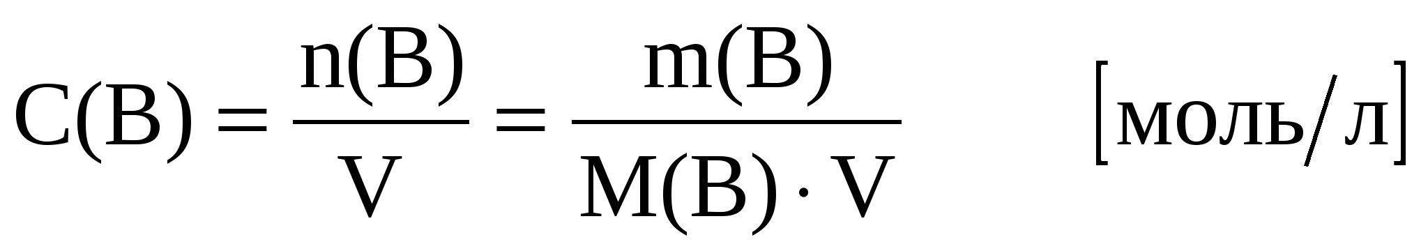1.Определим эквивалентную массу и эквивалент кальция, если известно, что при сгорании 0,5 г этого металла образуется 0,7 г оксида. Следовательно оксид содержит 0,5 г металла и 0,2 г кислорода, а эквивалентная масса кислорода 8 г/моль, отсюда: 0,5 г металла взаимодействует с 0,2 г кислорода, а Мeg(X) взаимодействует c 8 г кислорода Мeg(X) = Эквивалент кальция равен 1/2 моля. 2) Способы выражения концентрации растворов и расчеты в объемном анализе Количественный состав раствора в титриметрическом анализе выражают с помощью молярной концентрации – С. Молярная концентрация С(В) (молярность) – содержание количества растворенного вещества (В) в одном литре раствора: