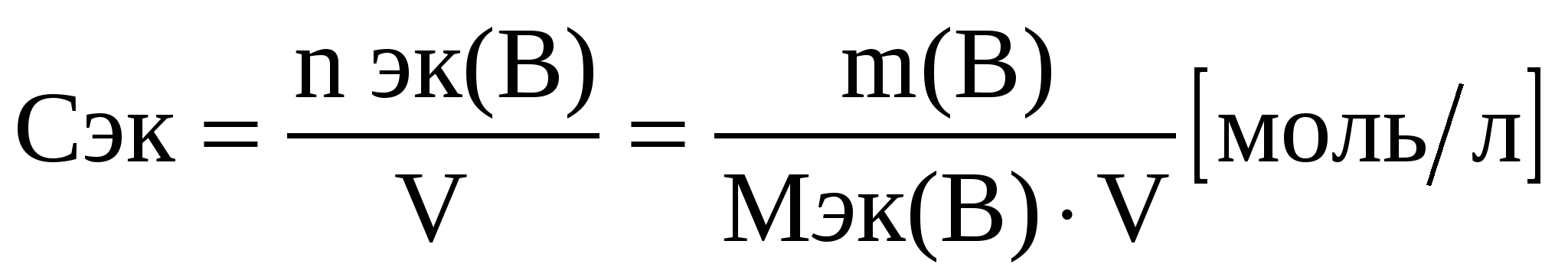 n(В)– количество вещества, моль; m(В) – масса растворенного вещества, г; М(В) – молярная масса вещества (В), г/моль; V – объём раствора, л. Для удобства расчетов в аналитической химии используют вспомогательный способ выражения состава раствора – молярную концентрацию эквивалента Сэк (нормальность) – это содержание количества вещества (В) эквивалентов в одном литре раствора: