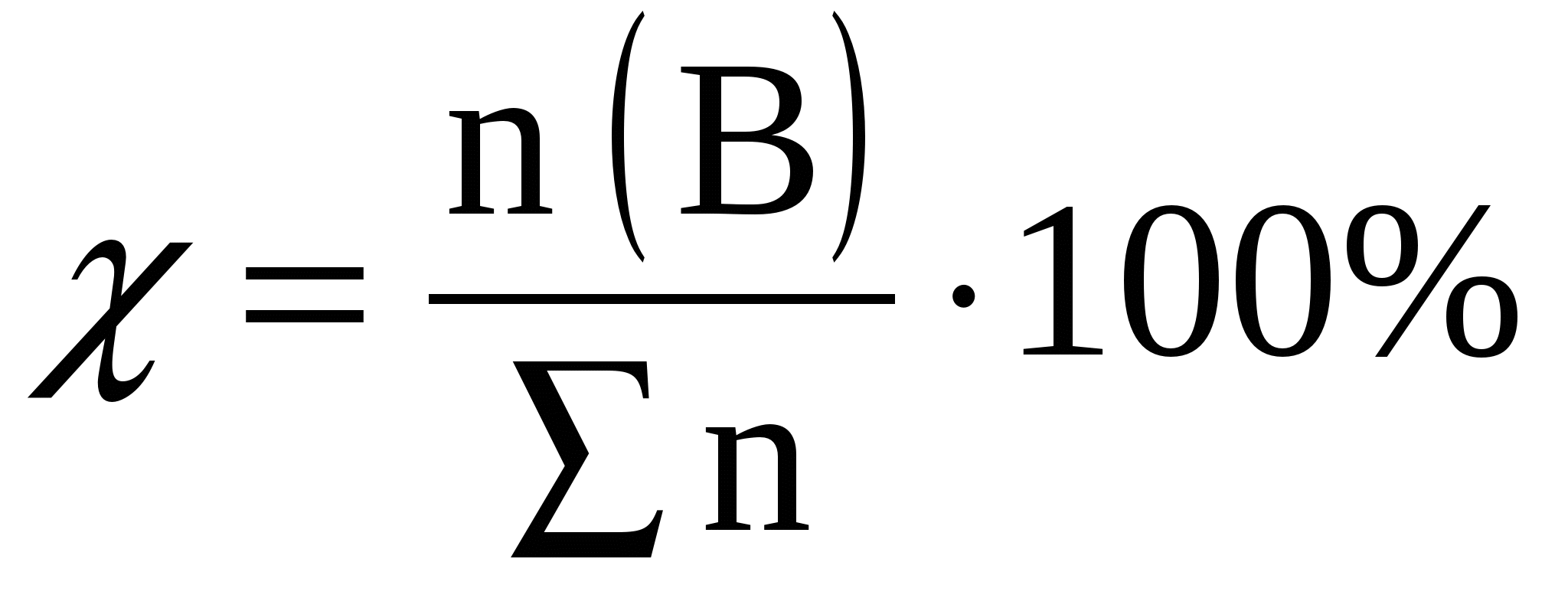 m(H2O) – масса растворителя Мольная доля χ – содержание количества моль растворенного вещества (В) к общему количеству моль всех веществ в растворе, выражается в долях или процентах: