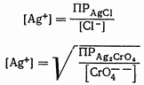 Стандартные растворы. В качестве стандартных растворов для определения анионов применяют нитрат серебра; для определения катионов серебра — хлорид натрия. Аргентометрическим методом пользуются главным образом для количественного определения галогенид-ионов и ионов серебра. Определение конечной точки титрования. В методе аргентометрии применяют как индикаторные, так и безындикаторные способы определения точки эквивалентности. Способы равного помутнения и способ просветления подробно описаны в § 2. Индикаторный способ. В качестве индикатора применяют раствор хромата калия (метод Мора, см. § 2). Применяемый в методе осаждения индикатор не должен изменять цвет до тех пор, пока определяемые ионы полностью не перейдут в осадок. Очевидно, этому условию может удовлетворять такой индикатор, который образует с ионами титрованного раствора окрашенный осадок, отличающийся большей растворимостью, чем растворимость основного осаждаемого вещества. Индикатор должен быть достаточно чувствительным по отношению к ничтожно малому избытку Наиболее широко в аналитической практике применяют хромат калия. Требуемую концентрацию индикатора вычисляют следующим образом. Например, при титровании хлоридов стандартным раствором