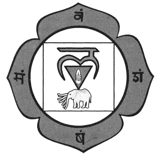 Символ «безликости», в отношении ребенка – «неосознанное просветление». Нет осознанного страдания, такого, какое испытывает взрослый под действием критики, оценивания (интеллекта), сильная, свободная, неуправляемая энергия. Связана с энергиями ИНСТИНКТА. Частота колебаний энергетической среды чакры соответствует красному цвету. Стихия чакры - земля. Символ - биджа - слог ЛАМ. При правильном произнесении этого слога в первой чакре создается блокировка, препятствующая прохождению энергий вниз, а при звучании М-М-М на конце слога возникают вибрации в верхней части головы. Мандала чакры представляет собой четырехлепестковый лотос, четыре лепестка - это не только, и не столько обозначение количества связей чакры с другими чакрами и меридианами, это, прежде всего, символическое отражение четырех составляющих жизни человека: минеральной, растительной, животной и духовной. В центре мандалы находится треугольник, символизирующий трехмерность нашего пространства и трехмерность самой сути материи: масса, энергия, пространство-время, а также проявление во всех планах бытия трех гун (Сатва, Раджас, Тамас).