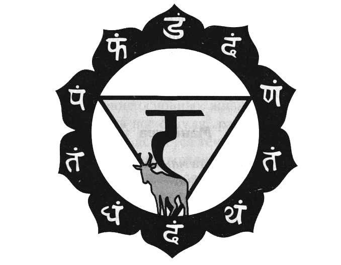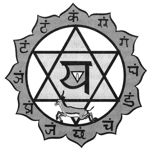 Символ-биджа - слог ЯМ (ЙАУМ). При произнесении этого звука язык как бы повисает во рту, а центром сосредоточения становится сердце. Мандала чакры представляет собою круг, обрамленный двенадцатью лепестками, обозначающими полевые связи чакры с двенадцатью основными меридианами. Мужской (ЯН) и женский (ИНЬ) аспекты энергии представлены расположенными в круге двумя равносторонними треугольниками. Вершина одного из них направлена вверх - ЯН, другого вниз - ИНЬ. Когда эти силы сливаются в гармонии, образуется устойчивое равновесие. В центре треугольника начертан корневой слог-биджа чакры ЯМ (ЙАУМ). Кроме того, эти треугольники указывают на общее равновесное, по отношению ко всей чакральной системе, положение анахаты - между тремя нижними и тремя верхними чакрами, то есть, данная чакра является как бы энергетическим центром организма, регулирующим как восходящие, так и нисходящие потоки, с другой стороны, – это символ «застывшего». Под треугольниками расположена антилопа (в некоторых вариантах начертания это олень) - символ настороженного и чуткого сердца, полного вдохновения, благородного и чистого. Глаза антилопы, прозрачные и ясные, символизируют невинность и притягательность, так же притягательны и глаза человека с преобладающей анахатой. Мантра чакры состоит из слогов, изображенных на каждом из двенадцати лепестков манд алы: КАМ, КХАМ ГАМ (биджавишудхи), ГХАМ, НГАМ, ЧХАМ, ЧХХАМ ДЖАМ, ДЖХАМ, ИНЬЯМ, ТАМ, ТХАМ. Энергии этой чакры - это энергии реализации информационных потребностей. Это – время развития личности, когда отраженный в сознании мир принимается как истинный. Это царство интеллекта, который вытесняет и отвергает все, что в него не вмещается. Приняв отражение мира в сознании (иллюзию), как истинное положение вещей, интеллект на этом не останавливается. Он обнаруживает и то, что его иллюзия отличается от иллюзий других людей и всегда ее отстаивает - хочет привить остальным «правильность» своего виденья. Потому, по отношению к другим, он принимает положение руководителя, т. е. стремится руководить, навязать, заставить принять, подменить иллюзию другого своей. Это и женские слезы, и «воспитательные моменты» в общении с детьми, и научные теории, и революции, и войны, и крестовые походы – вобщем большая часть осознанной истории человечества. Интеллект – «бог сам себе» и, в этом понимании, мы говорим о нем, как о «заглушке», как о моменте «застывшего действия» или многократного повторения пройденных ошибок. Это личное неосознанное, так как за осознанность принимается иллюзия. Это уровень Эго, которое не просто существует, выделяя себя из общего, а Эго, которое пытается активно руководить общим, это уровень активного отрицания общего во имя личного, это уровень амбиций, приверженностей одному способу, теории, направлению. Это личное неосознанное, потому что личность не просто живет в иллюзии своего восприятия, но и не может осознать иллюзорность этого восприятия. Выделение себя из внешнего мира и вступление в полную зависимость от него, в стремлении им руководить, менять. Не представляет себя вне общества, и стремится переделать его «под себя». Происходит еще гармоничное, относительно ровное смешивание энергий Космоса и Земли, которое направленно не только на «конкретно человеческие задачи», но и определяет их, как «максималь