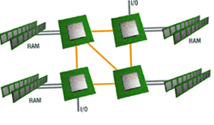 Hyper Transport ранее известная как Lightning Data Transport (LDT) - это двунаправленная последовательно/параллельная, полнодуплексная компьютерная шина с высокой пропускной способностью и малыми задержками шина, способная передавать данные одновременно в двух направлении (вниз- от процессора к чипсету и вверх- в направлении процессора от чипсета). Исторически HyperTransport разрабатывался AMD в качестве процессорной шины нового поколения специально для чипов с интегрированным контроллером памяти (архитектура AMD64). Напомним, что в многопроцессорных системах на основе AMD Opteron подсистема памяти "размазана" по всем процессорам - у каждого есть своя локальная память, подключенная через интегрированный контроллер, и каждый может обращаться к памяти любого другого процессора (рис. 1).