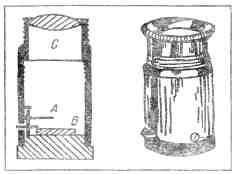 Рис. 14. Справа – прибор Крукса для наблюдения вспышек на сернистом цинке. Слева – схема прибора (А – пылинка радия на кончике иглы, В – сернистый цинк, С – лупа)