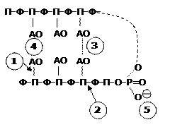 1.N-гликозидная 2. Фосфоэфирная 3. Водородная 4. Гидрофобное взаимодействие (стэкинг) 5. Ионная Примечание: П – пентоза, Ф – фосфат, АО – пуриновое или пиримидиновое основание Схема 2. Типы связей в полинуклеотидах