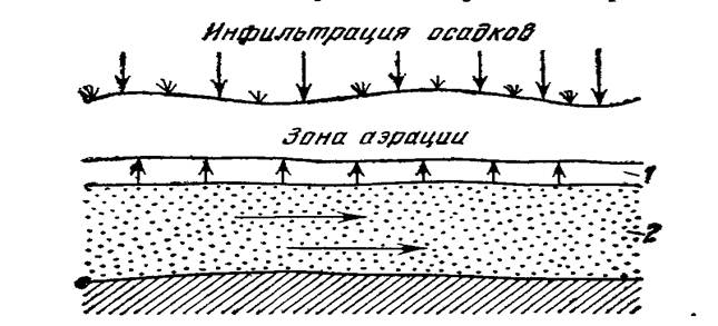 Рис.3.1 Распределение подземной воды в верхней части земной коры 1- капиллярная зона; 2 – водонасыщенная зона (грунтовый поток)