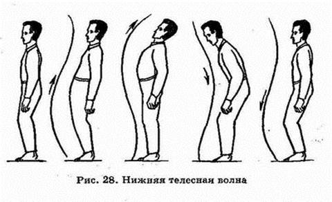 Для начала надо научиться управлять своим телом, вписывать его движения в телесную волну. Для этого проделаем несколько упражнений по правильному выполнению телесной волны и осознаванию движения собственного тела. Волна бывает нескольких видов. Мы с вами сделаем только два. Если вы сами захотите это упражнение модифицировать, то у вас есть широкое поле для творчества. Итак, нижняя телесная волна выполняется начиная от стоп, снизу вверх. Сначала согнем колени, выведем их и бедра (бедро анатомическое — от колена до тазобедренного сустава) вперед, за коленями выводим вперед живот, затем таз, дальше волна поднимается вверх по телу, заканчиваясь в голове (рис. 28).