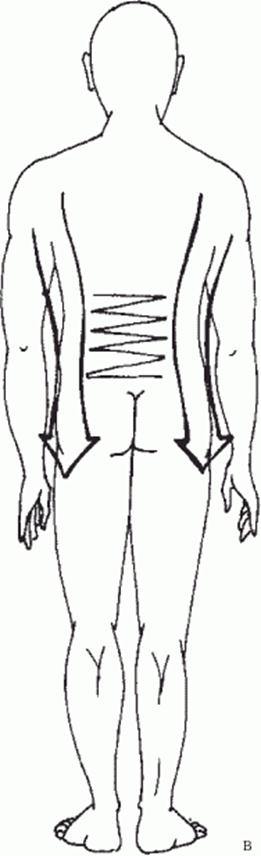 Направление движений при выполнении веничного массажа: а – со стороны спины; б – со стороны живота