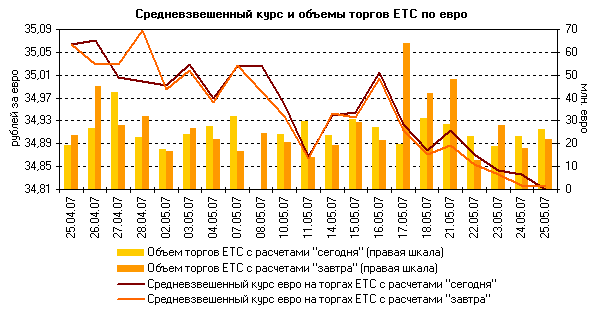 II.4. Динамика курсов доллара США и евро к рублю и показатели биржевых торгов за период с 21 по 25 мая 2007 года