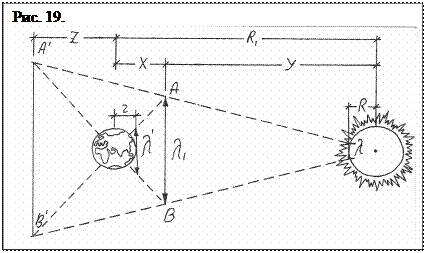 Подобный процесс сопровождает движение фотона в гравитационном поле, который изменяет не только свои размеры, но и частоту. Например, фотон или волна имеет на поверхности Земли длину l (рис. 18). При перемещении на высоту h длина волны изменится и станет равной l¢. Это изменение длины волны на величину Dl, (Dl = l - l¢) и фиксируется на высоте h как гравитационное красное смещение. Аналогично фотон или волна, идущая из космоса к Земле, имеет на высоте h длину волны l¢, и к поверхности она уменьшается по линейной зависимости до величины l. Спектроскоп же зафиксирует у этой волны фиолетовый сдвиг. Получается примерно следующая качественная картина: световая волна, сжимаясь, как бы немного деформирует гравиполя эфирных молекул, обусловливая их суперпозицию, вызывая изменение энергии волны, и внешне проявляясь как ее преломление. Суперпозиция обеспечивает проникновение волны через поле. Параметры движения волны зависят от плотности окружающего пространства. Используя линейную зависимость длины волны от напряженности гравитационного поля, рассмотрим движение светового луча с длиной волны А = 4000 А ° от Солнца к поверхности Земли. Поскольку излучение движется в пространстве с изменяемой напряженностью гравитационного поля, то длина волны возрастает до той нейтральной зоны АВ (рис. 19), в которой напряженность гравиполя Солнца - go сравнивается с напряженностью гравиполя Земли - g; go = g.