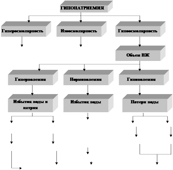 Причины этого состояния рассмотрены выше. Основные из них: избыток воды, преимущественные потери натрия, избыток воды и натрия (вторичный гиперальдостеронизм). Натрий не теряется без воды, поэтому, теоретически, потеря изотонической и гипотонической жидкости не должно вызывать гипонатриемии. Тем не менее, в такой ситуации она достаточно типична, поскольку на снижение ОЦК первым реагирует альдостерон, поднимая концентрацию натрия в плазме, следовательно, и осмолярность. Повышенная осмолярность стимулирует осморецепторы и вызывает гиперсекрецию АДГ, который удерживает жидкость и «разводит» плазму, обуславливая появление гипонатриемии. Существуют два достаточно редких синдрома, при которых концентрация натрия в плазме снижается. Первый из них – синдром неадекватной секреции АДГ (СНСАДГ). Он заключается в том, что в результате повреждения гипоталамуса, повышается секреция АДГ, следовательно, снижается диурез, развивается гиперволемия и снижаются концентрации основных электролитов в плазме. Второй синдром – синдром больной клетки. Такой диагноз ставят, когда гипонатриемия не имеет видимых причин. Считается, что причиной синдрома является повышение проницаемости клеточных мембран для натрия с неизменной или сниженной работой натрий-калиевого насоса. Схема 1. Алгоритм диагностики и лечения гипонатриемии