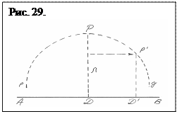 “Принудительное” движение по гиперболической ветви Рр (рис. 28) будет сопровождаться замедлением как горизонтальной, так и вертикальной скорости, но никогда не приведет к “соединению” точек P и D потому, что “ранг” напряженности этих точек-тел сравнялся в точке Р и только граничные условия уравнения обусловливают их все замедляющееся сближение. Возрастающая плотность нейтральной зоны между ними может привести к тому, что в какой-то момент (этот момент в настоящее время в уравнении движения точек, похоже, отсутствует за ненадобностью), который может быть обозначен, например, буквой Г, сжатие сменится отталкиванием и ситуация начнет зеркально повторяться. В точке Р1 появится восходящая в направлении А ветвь гиперболы, а далее эллиптическая полуветвь аналогичная полуветви qРq¢ рис. 27 (только таким образом могут одновременно проявлять себя кривые р и q, и, следовательно, представление об их пересечение в одной точке возможно лишь в статике, т.е. без движения). Все это в том случае, если мы требуем бесконечного движения Р во времени вдоль прямой АВ. Естественно также, что при отсутствии точки Г точки Р и D будут бесконечно сближаться, но никогда не сольются (не пересекутся). То есть оказываются параллельными. Таким образом, «параллельные» Лобачевского есть следы траектории движения двух взаимодействующих в различных условиях и направлениях тел, «состыкованные» в точке Р (рис. 27) в области равенства их напряженностей и образовавшие эквидистанту. Если же Р – ближайшая к прямой АВ точка следа траектории и после нее траектория начинает удаляться от прямой АВ, образуя «седловину», то данная кривая не имеет разрыва в точке Р. И полуэллипсы Р¢¢Р и РР¢ образуют основную фигуру статической геометрии Лобачевского. Ситуация с движением “прямых”− следов движущихся точек-тел p и q через Р в эллиптической римановой геометрии практически аналогична предыдущей и отличается только тем, что точка Р является наиболее удаленной от АВ точкой образующихся следов, а “прямые” по обе стороны от нее по уравнению не имеют возможности “подниматься” над точкой Р и потому расходятся в разные стороны с медленным приближением к АВ, сразу демонстрируя таким образом, что точка Р является точкой разрыва, поскольку для получения двух полудуг приходится двигаться в противоположных направлениях. Т.е. совершать качественно различные движения. Коротко опишем получаемые фигуры. Предположим, что точка Р находится на некотором расстоянии от точки Д. Ранг обоих точек одинаков и они движутся в одном направлении но граничные условия уравнения “заставляют” их сближаться таким образом, что одна из них Д перемещается вдоль прямой АВ, а другая приближается к ней (рис. 29). Разница между рис. 27 и рис. 29в том, что граничные условия движения точки р¢: в первом случае (на рис. 27) обусловливают точке прохождение одной части траектории р¢Р как бы повторяя естественное падение тела на другое (точнее вдоль другого, фиктивно отображенного прямой АВ) с возрастающей горизонтальной скоростью из бесконечности к точке Р, а второй части Рр по искусственной траектории, когда граничные условия “заставляют” точку (тело) Р двигаться приближаясь к точке (телу) Д по гиперболической траектории. во втором случае(рис. 29) точка Р является наиболее удаленной от точки Д и принудительное движение в 