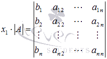 Метод Крамера. Метод Крамера применяется для решения систем линейных алгебраических уравнений (СЛАУ), в которых число неизвестных переменных равно числу уравнений и определитель основной матрицы отличен от нуля. В этой статье мы разберем как по методу Крамера находятся неизвестные переменные и получим формулы. После этого перейдем к примерам и подробно опишем решение систем линейных алгебраических уравнений методом Крамера Метод Крамера - вывод формул. Пусть нам требуется решить систему линейных уравнений вида В матричном виде эта система может быть записана как A ⋅ X = B, где Будем считать, что матрица А – невырожденная, то есть, ее определитель отличен от нуля. В этом случае система линейных алгебраических уравнений имеет единственное решение, которое может быть найдено методом Крамера. (Методы решения систем при Метод Крамера основывается на двух свойствах определителя матрицы: 1. Определитель квадратной матрицы 2. Сумма произведений элементов какой-либо строки (столбца) квадратной матрицы на алгебраические дополнения соответствующих элементов другой строки (столбца) равна нулю: Итак, приступим к нахождению неизвестной переменной x1. Для этого умножим обе части первого уравнения системы на А1 1, обе части второго уравнения – на А2 1, и так далее, обе части n-ого уравнения – на Аn 1 (то есть, уравнения системы умножаем на соответствующие алгебраические дополнения первого столбца матрицы А): Сложим все левые части уравнения системы, сгруппировав слагаемые при неизвестных переменных x1, x2, …, xn, и приравняем эту сумму к сумме всех правых частей уравнений: Если обратиться к озвученным ранее свойствам определителя, то имеем Аналогично находим x2. Для этого умножаем обе части уравнений системы на алгебраические дополнения второго столбца матрицы А: Складываем все уравнения системы, группируем слагаемые при неизвестных переменных x1, x2, …, xn и применяем свойства определителя: Откуда Аналогично находятся оставшиеся неизвестные переменные. Если обозначить