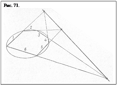 Фигура, изображенная на рис. 71, чуть ли не единственная в проективной геометрии явно отображающая все входящие в ее структуру элементы. А изложенное объяснение ее построения демонстрирует односторонность современного статического подхода к рассмотрению образовавшейся фигуры. Математик, построивший в коническом сечении шестиугольник, полагает, что за пределами шестиугольника ничего нет. И это совершенно правильно, если фигура принадлежит статической геометрии. Но если она относится к проективной геометрии, то сама фигура «знает», что она всего только базисный, опорный элемент единой невидимой фигуры. Вторым элементом является базисная прямая, проходящая за ее пределами и потому попарные лучи, продолженные за пределы сторон шестиугольника обязательно пересекутся на базисной прямой.
