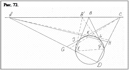 Проведем построение вписанного шестиугольника иначе, чем было описано выше. Возьмем опорную окружность и на некотором расстоянии от нее базисную прямую, на которой находятся точки А, В, С. На окружности расположена точка D, место схождения двух сторон шестиугольника (рис. 72.). Соединим точки А и С прямыми с точкой D. Точки пересечения Е и F прямых с окружность соединим прямыми с точкой В. Получим новые точки I и L. Из точки С через точку I проведем прямую до пересечения с прямой АD в точке G. А из точки А прямую через L до пересечения с прямой СD в точке Н. Точка пересечения этих прямых К окажется на окружности и замыкает шестигранник. Шестигранник DЕIКLF построен. Он составлен тремя треугольниками АDН, ВFЕ, СDG. Стороны этих треугольников, проходящие внутри окружности, и образуют искомый шестигранник. Он весь включен в треугольник АСD и одновременно, отсекаемыми хордами, вписан в опорную окружность.