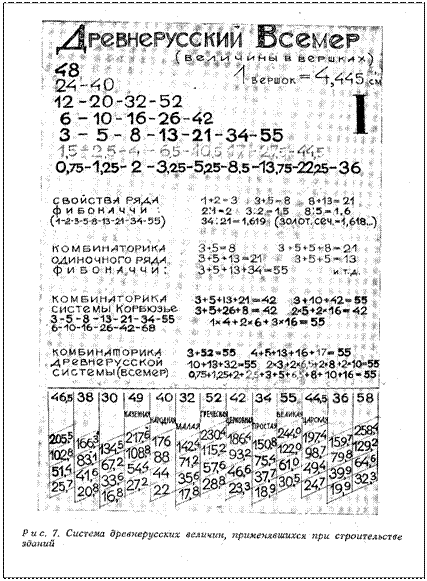 Рассмотрим более развитый вариант системы величин пропорционирования, дополнив двухрядную модулорную схему новыми рядами Фибоначчи: 24 40 12 20 32 52 6 10 16 26 42 3 5 8 13 21 34 55 1,5 2,5 4 6,5 10,5 17 27,5 44,5 0,75 1,25 2 3,25 5,25 8,5 13,75 22,25 36 58,25 и т.д. Все горизонтальные линии являются здесь, рядами Фибоначчи (в средней части − третий и четвертый снизу − знакомые нам ряды схемы модулора). Во вновь дополненных рядах, так же как и в прежних, сумма двух предыдущих членов равна последующему, а отношение двух соседних приближается к величине золотого сечения (тем больше, чем дальше от начала ряда). По вертикальным направлениям мы продолжили структуру удвоения величин (вверх) и половинных значений (вниз); поэтому отношение по вертикали составляют 1: 2: 4: 8.... В этой схеме каждый из горизонтальных рядов обладает комбинаторикой одиночного ряда Фибоначчи; каждая пара рядов комбинаторикой модулора Корбюзье, а весь комплекс величин − еще более высокими комбинаторными свойствами. Взаимозависимости между величинами распространяются теперь на все их поле. Любую из величин можно получить множеством различных вариантов и комбинаций. Приводить все варианты мы, разумеется, не в состоянии, столь их мнoгo; покажем лишь на одном из примеров возможное получение одной и той же величины слагаемыми разных рядов: 3 + 52 = 55 10 + 13 + 32 = 55 4 + 5 + 13 + 16 + 17 =55 2 х 3 + 2 х 6,5 + 2 х 8 + 2 х 10 = 55 Таким образом, рассмотренная нами схема обладает несравнимо более высокими комбинаторными свойствами, чем две предыдущие. Это обстоятельство является чрезвычайно важным для пропорционирования в архитектуре − одним из наиглавнейших. Однообразие, многообразие и возможность выбора зодчим желаемого варианта компоновки зависят, в конечном счете, от количества вариантов и их эстетического богатства или скудности. Именно по этой причине модулор Корбюзье оказался значительным шагом вперед − по сравнению с одиночным рядом Фибоначчи − и получил всеобщее признание. Рассмотренная же схема являет собой такой же, если не еще больший, шаг вперед по сравнению с модулором. Эта схема отображает систему величин, функционировавших у нас на Руси еще за пять-шесть веков до Корбюзье, а может быть и ранее. Подобно модулору, она была связана также с системой мер и обладала многими замечательными свойствами. Как системе пропорционирования, мы дали ей условное наименование древнерусский «всемер», которое, по нашему мнению, должно отражать ее всеобъемлющий характер − функционирование в архитектуре и в обычных мерных операциях. Покажем присутствие в ней всех древнерусских (рассчитанных нами) саженей, о которых мы ранее говорили. Выпишем в один ряд величины, завершающие вертикальные столбцы схемы, в порядке слева направо: 48 40 32 52 42 34 55 44,5 36 58,25 Напомним далее рассмотренные нами древнерусские сажени и разместим их в следующем порядке: 217,6 ∕ 49; 176 ∕ 39,5; 142,4 ∕ 32; 230,4 ∕ 52; 186,4 ∕ 42; 150,8 ∕ 34; 244 ∕ 55; 197,4 ∕ 44,5; 159,7 ∕ 36; 258,4 ∕ 58,25 В верхнем ряду (в числители) даны размеры саженей в сантиметрах; в нижнем же (знаменателях) − размеры в вершках с округлением до 1/4 вершка (1 вершок = 4,445 cм). Выраженные в вершках размеры древнерусских саженей и их соподчиненные единицы совпадают с величинами только что рассмотренной схемы − обстоятельство, на котором мы специально остановимся ниже. Отклонения происходят лишь в начале ряда, в двух первых членах. Несовпадения представляют co6oй т
