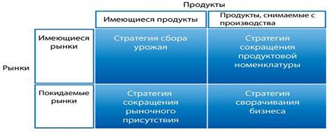 Стратегия расширения присутствия на освоенных рынках может быть весьма успешной, когда организация имеет технологические или производственные преимущества, которые позволяют увеличивать рыночную долю за счет конкурентов. Такие стратегии обычно являются высокозатратными, так как, помимо вложений в технологию и производство, сопровождаются использованием относительно низких, по сравнению с конкурентами, цен. Стратегия развития продукта предполагает разработку, производство и сбыт новых продуктов на освоенных рынках. Реализация такой стратегии прежде всего, предполагает наличие развитой научно-исследовательской и конструкторской базы и персонала, мотивированного на поиск и освоение новых идей. Применение данной стратегии может закончиться неудачей, если конкурент может легко скопировать продукт, сэкономив на НИОКР, производстве и сбыте. Стратегия развития новых рынков предполагает поиск новых рынков для сбыта освоенных продуктов. Такая стратегия подразумевает большие инвестирования в новые рынки; она, как правило, носит достаточно агрессивный характер и предполагает высокий накал конкурентной борьбы. Стратегия диверсификации заключается в поставках новых продуктов на новые рынки. Этот термин часто ассоциируется с экспансией в область, не связанную с текущей деятельностью организации. Такую стратегию, требующую для своей реализации больших инвестиций, могут проводить обычно только крупные организации. При ее реализации возникают большие трудности достижения эффективного управления. Как было сказано выше, организация СХЕ является ответом на эти трудности. Тенденции последних лет заключаются в том, что организации стараются диверсифицироваться в рамках своих компетенции, используя в полной мере свой накопленный опыт. Выделяют ряд подвидов стратегии диверсификации. В случае, когда организация ищет новые продукты, которым свойственны синергетические эффекты с существующими продуктами и с маркетингом относительно этих продуктов, даже если эти продукты ориентированы на других потребителей, такая стратегия называется концентрической диверсификационной стратегией. Когда же организация ищет новые продукты, которые можно поставлять существующим потребителям, но не связанные с технологией существующих производственных линий, то используется стратегия горизонтальной диверсификации. Наконец, организация может искать новые направления деятельности, не связанные с традиционными для организации технологиями, продуктами или рынками. В этом случае используется стратегия конгломератной диверсификации. Выбор стратегий деятельности для организаций, находящихся в стадии спада, характеризуется своей спецификой (рис. 3). Рис. 3. Стратегии спада Когда организация уменьшает свою деятельность, как с точки зрения продуктов, так и рынков, то она уменьшает инвестирования во все элементы комплекса маркетинга и стремится максимизировать прибыль или минимизировать издержки даже при уменьшении объема продаж. Такая стратегия называется стратегией сбора урожая. Она часто используется при переходе на новую модель относительно заменяемой модели. Если организация не меняет номенклатуру выпускаемой продукции, но покидает некоторые рынки, то она проводит стратегию сокращения рыночного присутствия. Покидают рынки п