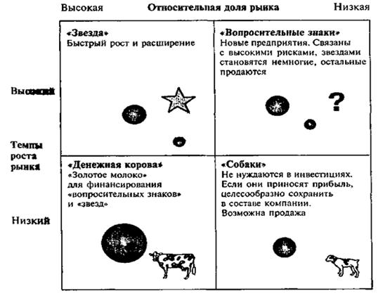 Портфельный анализ применяется, когда "в портфеле" фирмы имеется несколько бизнес-единиц и товарных линий. При разработке стратегии могут учитываться ситуации изменения "портфеля", т.е. добавления новых бизнес-единиц или производство новых товаров либо отказа от убыточных и неперспективных направлений ведения бизнеса. Портфельный анализ используется, когда каждое самостоятельное подразделение компании (стратегическая бизнес-единица — СБЕ) имеет миссию, собственные товарные линии, специфических для нее конкурентов и свои рынки сбыта. Стратегическому руководству корпорации предстоит решить, какие СБЕ поддерживать в первую очередь, за счет каких подразделений черпать средства для такой поддержки, а какие СБЕ оценивать как неперспективные. Наиболее известным средством портфельного анализа является матрица "Бостон Консалтинг групп" (BCG). Эта матрица объединяет темпы роста рынка и долю рынка, приходящуюся на данный продукт, производимый фирмой (рис. 8). Показатель темпов роста бизнеса отражает развитие отрасли, в которой действует СБЕ, а показатель доли рынка — позиции СБЕ на рынке в сравнении с конкурентами. Матрица предполагает четыре сценария развития продукта, которые получили наименование "звезда", "денежная корова", "вопросительные знаки" и "собаки". "Звезда" — продукт, который имеет значительную долю в растущем рынке. Компания с продукцией в этом квадрате обычно затрачивает значительные средства для ее поддержки, однако, благодаря воздействию кривой роста производительности труда, затраты с течением времени уменьшаются. "Денежная корова" — продукт, имеющий большую долю в зрелом рынке. Потребность в расходах на сбыт меньше. Такой продукт является поставщиком средств для инвестирования в новый продукт. "Вопросительные знаки" ("трудные дети") существуют в растущем рынке, они страдают от незначительности своей доли в нем. Для увеличения доли необходимы большие средства. Однако в случае отсутствия перспективы продукт может быть снят с производства. "Собаки" имеют небольшую долю на статичном или сокращающемся рынке, требуют непропорционально больших объемов затраты средств и "пожирают" ресурсы компании. Чаще всего корпорации ищут возможность освободиться от СБЕ этой группы.