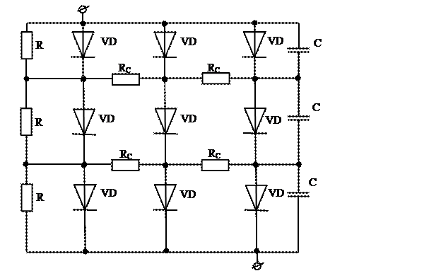 Вследствие разброса величин обратных сопротивлений диодов одного и того же типа на отдельных диодах обратное напряжение может оказаться выше допустимого, что повлечет за собой пробой диода. При решении задачи следует сравнить расчетные обратные напряжения каждого диода с заданным обратным повторяющимся напряжением одного диода, и сделать вывод. Для уменьшения разброса не более 10% применяют: подбор, шунтирование резисторами одинакового сопротивления, емкостные и R-C цепи.