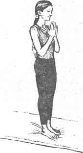 Встаньте прямо, поставьте ноги параллельно друг другу, равномерно распределив вес тела на обе ноги. Сложите ладони рук вместе перед грудью. Оставайтесь в позе примерно пять секунд. Дышите свободно.