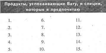 Молочные продукты. Все молочные продукты способствуют успокоению Ваты. Перед употреблением молоко всегда кипятите и пейте его теплым. Не употребляйте молоко вместе с обильной едой. Сладости. Все сладости (в умеренных количествах) благоприятствуют успокоению Ваты. Однако употребление концентрированного сахара без других продуктов может вызвать всплеск энергии и привести вас в состояние повышенного возбуждения. Если вы едите, к примеру, сахарные леденцы, старайтесь употреблять вместе с ними что-нибудь более питательное, например молоко, чтобы уравновесить действие сахара. Нерафинированный сахар предпочтительнее рафинированного. Масла. Все o масла полезны, поскольку они уменьшают Вату. Крупы. Очень полезны рис и пшеница. Употребляйте меньше ячменя, кукурузы, проса, гречихи, ржи и овса. Фрукты. Отдавайте предпочтение сладким, кислым и сытным фруктам, таким как апельсины, бананы, авокадо, виноград, вишни персики, дыни, ягоды, сливы, ананасы, манто и папайя. Ограничьте потребление вяжущих или легких фруктов, таких как яблоки, груши, гранаты и клюква. Овощи. Полезны свекла, огурцы, морковь, спаржа и сладкий картофель. Их следует есть вареными, а не сырыми. В умеренных количествах можно употреблять следующие вареные овощи, особенно если они приправлены топленым сливочным или растительным маслом и специями, понижающими Вату: горох, зеленые листовые овощи, брокколи, цветную капусту, сельдерей и картофель. Желательно избегать брюссельской и белокочанной капусты. Специи. Приемлемы кардамон, тмин, имбирь, корица соль, гвоздика, горчичное семя и небольшие количества черного перца. Орехи, Все орехи полезны. Бобовые. Ограничьте потребление всех бобовых, за исключением розовой чечевицы. Мясо и рыба (для не вегетарианцев). Приемлемы курица, индейка и блюда из морских продуктов. Баранины следует избегать. Составьте список продуктов и специй из диеты, успокаивающей Вату, которые вы предпочитаете. Затем спланируйте несколько приемов пищи, включающих эти продукты. Запишите, как вы чувствовали себя после принятия этой пищи.
