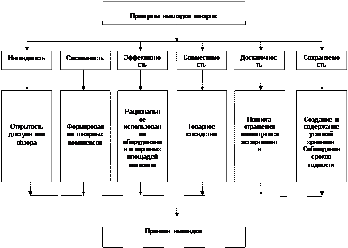 Чем больше площади займет товар, тем лучше он будет заметен и тем больше внимания к себе привлечет. Рекомендуется на полках иметь не менее трех — пяти единиц товара одного и того же наименования. При осуществлении выкладки полезно руководствоваться правилом «перекрестного опыления», предусматривающим размещение разных товарных групп по соседству, что способствует увеличению объема продаж каждой из них (например, размещение крема для обуви не только в отделе бытовой химии, но и в обувном отделе). Такие товары обычно связаны в сознании покупателя позитивной ассоциативной цепочкой. Организация специальных выкладок одновременно двух товаров может увеличить продажу каждого из них до 80%. Основополагающий принцип размещения (выкладки) — поиск нужного товара для покупателя должен быть в максимальной степени облегчен. Для облегчения потребителю поиска и выбора необходимых товаров следует соблюдать определенные принципы и правила выкладки товара в торговом зале (рис. 3.1).
