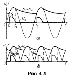 Емкостной фильтр состоит из конденсатора, подключаемого параллельно нагрузке, при этом напряжение u н= u C определяется процессами заряда и разряда конденсатора. В однополупериодном выпрямителе конденсатор C ф будет заряжаться через вентиль, если u 2> u C (интервал времени t 1 – t 2 на рис. 4.4). Когда u2 < u C (t 2 – t 3), вентиль закрыт, и конденсатор разряжается через сопротивление нагрузки R н с постоянной времени t р= C ф R н; при этом