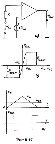 Пороговые устройства предназначены для сравнения двух входных величин. В рассматриваемых схемах сравниваются постоянное U оп и переменное U вх напряжения. На рис.8.17,а приведен двухвходовый компаратор, у которого сравнивающиеся сигналы поступают на оба входа усилителя. Поэтому состояние выхода компаратора (полярность выходного напряжения) определяется большим по уровню напряжением одного их входов, что отражает идеализированная (без учета гистерезиса) передаточная характеристика (рис.8.17,б). При равенстве входных напряжений выходное напряжение равно нулю. При DU вх= U оп- U вх> 0 наряжение на выходе ОУ будет равно U вых= U вых.m, если же DU вх= U оп- U вх< 0, то U вых= - U вых.m.