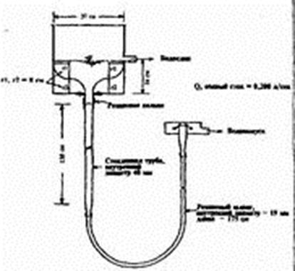 Если воду, содержащую крупные взвешенные частицы, сначала взболтать в стеклянной мензурке, а затем оставить ее вращаться самостоятельно, то взвешенные частицы сами по себе сконцентрируются около оси вращающегося цилиндра воды. Это известное естественное явление уже используется на практике в циркулярном пескоуловительном механизме компаниями Geiger, Karlsruhe и в «Гидроциклоне» компании Stami-Carbon для очищения воды от примесей. В обоих случаях содержимое цилиндрических контейнеров вращают, подавая струю воды по касательной к окружности цилиндра, что» как считается, и является причиной концентрации взвешенных частиц по вертикальной оси поворачивающегося цилиндра жидкости. Однако, если воду подавать из большого вместительного контейнера в водозаборную трубу и при этом заставлять ее вращаться то быстрее, то медленнее, сформировывается всасывающая воронка, размер и глубина которой изменяется в зависимости от скорости течения в водовыпуске. Внимательные люди часто наблюдают формирование таких всасывающих воронок в сливах ванн и бассейнов. Закручивание воды в трубе развивается от входного отверстия в направлении водовыпу-ска, и дальнейшее движение воды непосредственно в трубе водовыпуска становится результатом этих взаимных влияний, течение состоит из одновременно объединенных нескольких трехмерных пространственных кривых, которые можно сделать видимыми нижеизложенным образом. Вода вытекает из сосуда, в котором постоянно поддерживается уровень воды, в стеклянную трубу 40 мм1 в диамет- Чтобы помочь читателю, незнакомому с метрической системой мер, избежать трудностей, связанных с употреблением британских или американских единиц измерения, издатель предоставляет следующие соотношения: 1 литр (л) = 0,22 брит, галлонов = 0,26 амер, галлонов; 1 миллиметр (мм) = 0,03937 дюйма; 1 кв. миллиметр (мм3) = 0,00115 кв. дюйма; 1 куб. миллиметр (мм1) — 0,00006102 дюйма3; 1 сантиметр (см) = 0,3937 дюймов, 1 кв. сантиметр (смг) = 0,155 кв. дюйма; 1 куб, сантиметр (см1) = 0,06102 дюйма3; 1 дециметр (дм) = 3,937 дюйма; 1 кв. дециметр (дм2) = 15,5 кв. дюйма; 1 куб. дециметр (см1) = 61,02 дюйма3; 1 метр (м) — 39,37 дюйма (3,28 футов); 1 кв. метр(м2)= 10,764 кв, футов; 1 куб, метр (м*) = 35,315 дюйма1 ре и продвигается вперед с помощью резинового брандспойта 19 мм в диаметре к водоотводу. Если, как в случае испытания 1 (чертеж № 1), сосуд и подача воды были организованы таким образом, что могло развиться только очень слабое спиралевидное движение во входном отверстии трубы, то в случае испытания 2 (чертеж № 2) наращиванию спирального движения преднамеренно помогали форма трубы и тангенциальный приток воды. В испытываемую трубу диаметром 40 мм с площадью сечения 0,125 дм2 подавалась вода со скоростью 0,2 и 0,21 л/сек так, чтобы скорость течения в ней была равна около 1,6 — 1,68 дм/сек. Это уже в пределах скорости бурного потока. Тонкая шелковая нить, привязанная к концу, опускалась прямо вниз, в испытательную трубу, и в состоянии покоя, благодаря потоку воды, текущему через трубку, вовлекалась в медленное вращательное движение и становилась похожей на закрученную трехмерную спираль. В эксперименте № 2 искривление нити было сильнее, чем в первом, благодаря более интенсивному закручиванию на водозаборе. Также, помимо этого, было установлено, что мелкозернистые нерастворимые примеси, равномерно распределенные по воде с помощью мелкого сита, собрались