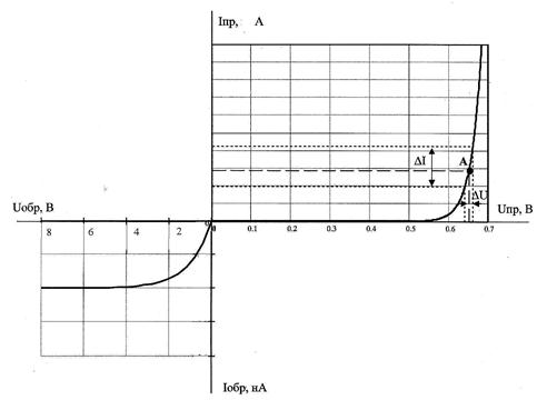 Для определения дифференциального cопротивления выбирите на линейном участке прямой ветви вольтамперной характеристики рабочую точку А и задав небольшое приращение