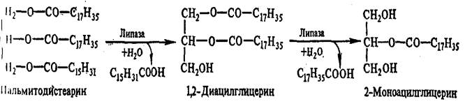 Эти реакции осуществляют липазы, специфичные в отношении 1,3-эфирных связей триацилглицерина. Связи во 2-м положении гидролизуют другие липазы: