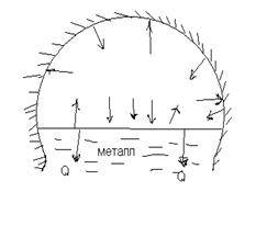 Направленный косвенный режим радиационного теплообмена. Подобный вид теплообмена имеет место в том случае, когда тепло, выделяющееся при сгорании топлива, передается нагреваемому материалу не непосредственно от пламени, а через посредника, которым чаще всего является кладка свода печи. Нагреваемый металл имеет сплошной спектр поглощения, поэтому надо стремиться, чтобы падающий на него тепловой поток сплошной спектр излучения. Направленный косвенный теплообмен создают размещением факелов (пламени) в верхней части рабочего права печи приближая область минимальных температур к поверхности огнеупора. При это происходит рост температуры кладки и трансформирование селективного излучение кладки. В последнее время широкое распространение получает сводовое отопление печи, которые работают в указанном режиме теплообмена. Для достижения этой цели применяют различного рода горелки, создающих плоский разомкнутый факел (плоскопламенныегорелки) у которых возникшее пламя тонким слоем распространяется по поверхности свода, обеспечивая высокую теплоотдачу. В печах, работающих с направленным косвенным радиационным режимом, излучение кладки на металл играет важнейшую роль, и величина степени развития кладки имеет в этом случае большее значение, чем при равномерно распределённом режиме. Данный вид телеобмена целесообразно применять, когда необходим равномерный нагрев. Необходимо отметить, что термин “косвенный нагрев” часто применяют в несколько ином смысле, связанный с осущёствлением муфельного нагрева металла. В ряде случаев нагрев металла в термических печах должен осуществляться без малейшего окисления, которое возможно лишь в том случае, когда поверхность металла не соприкасается с продуктами сгорания топлива. Избежать этого можно, если отделить газы от металла. В этом заключается принцип муфелирования. Можно отделить газы от металла, выполнив снижение топлива в радиационных трубах. Другой метод заключается, когда металл закрывается жароупорном муфеле. И в том и другом случае будет иметь место косвенный нагрев, т.е. называется без возможности соприкосновения металла и окисляющих газов.
