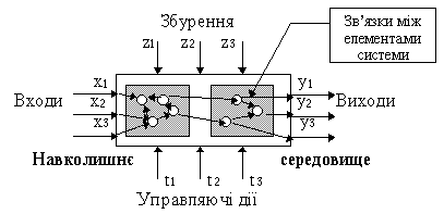 Така модель системи перш за все вказує на її призначення, а вже потім на те, що можливо в ній є. Кількість входів і виходів системи може бути необмежена, що є основним недоліком такої моделі. Простота моделі обманює, тому що існує можливість втрати деяких входів або виходів, які можуть вважатися несуттєвими. Другий рівень зображення системи - це зображення з урахуванням складових елементів системи (Рис. 1.5).