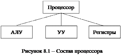 1.2.3 В состав процессора входят арифметико – логическое устройство (АЛУ), устройство управления (УУ) и группа регистров – локальная память (рисунок 1.1). Регистр процессора – разновидность оперативного запоминающего устройства, встроенного в процессор.