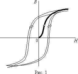 Если в процессе намагничивания довести напряженность поля до некоторого значения, а затем начать уменьшать, то уменьшение индукции будет происходить медленнее, чем при намагничивании и новая кривая будет отличаться от первоначальной. Кривая изменения индукции при увеличении напряженности поля для предварительно полностью размагниченного вещества называется начальной кривой намагничивания. На рис. 1 она показана утолщенной линией. После нескольких (около 10) циклов изменения напряженности от положительного до отрицательного максимальных значений зависимость B = f (H) начнет повторяться и приобретет характерный вид симметричной замкнутой кривой, называемой петлей гистерезиса.Гистерезисом называют отставание изменения индукции от напряженности магнитного поля. Явление гистерезиса характерно вообще для всех процессов, в которых наблюдается зависимость какой-либо величины от значения другой не только в текущем, но и в предыдущем состоянии, т.е. B 2= f (H 2, H 1) - где H 2 и H 1 - соответственно текущее и предыдущее значения напряженности.