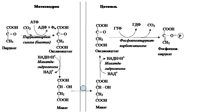 Рис. 6. Этапы образования ФЕПВК С помощью первого получается о ксалоацетат, который восстанавливается до малата и переходит через мембрану в цитозоль, где вновь окисляется и под действием фосфоенолпируваткарбоксикиназы преобразуется в фосфоенолпируват. Второй обходной путь протекает с помощью фермента фруктозо-1,6-дифосфатазы (рис. 7).