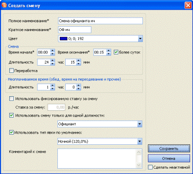 4. Введите время начала и окончания смены. Автоматически будет рассчитана ее длительность. Если смена продолжается более суток, то для правильного расчета ее длительности установите галочку в поле более суток. 5. Внутри интервала смены Вы можете задать время на перерыв в работе, которое не будет оплачено, например, обед. 6. Если смена соответствует рабочим часам сверх нормы (например, незапланированная работа в выходные дни), то установите галочку в поле Переработка. Примечание. Примечание В расчете заработной платы для сотрудников с фиксированным окладом смены с признаком «Переработка» не участвуют. Оплата за такие смены будет начисляться сверх оклада. 7. Если Вы хотите, чтобы сотрудникам, которые отработают такую смену, оплата была рассчитана не по их тарифам (указанным в карточках), а по определенной ставке за час смены, поставьте галочку в поле Использовать фиксированную ставку за смену и введите значение. 8. Для того чтобы данная смена могла быть назначена только сотрудникам с определенной должностью, поставьте галочку в поле Использовать смену только для одной должности и выберите ее из списка. 9. Оплата сотрудника за назначенную смену рассчитывается следующим образом: Длительность явки (сколько часов засчитано) за вычетом неоплачиваемого времени умножается на ставку и на поправочный коэффициент, заданный для явки. Явка сотрудника регистрируется автоматически при открытии смены в iikoFront, а также может быть зарегистрирована вручную менеджером в iikoOffice. 10. При необходимости введите дополнительную информацию о смене (поле Комментарий к смене) и нажмите кнопку Сохранить.