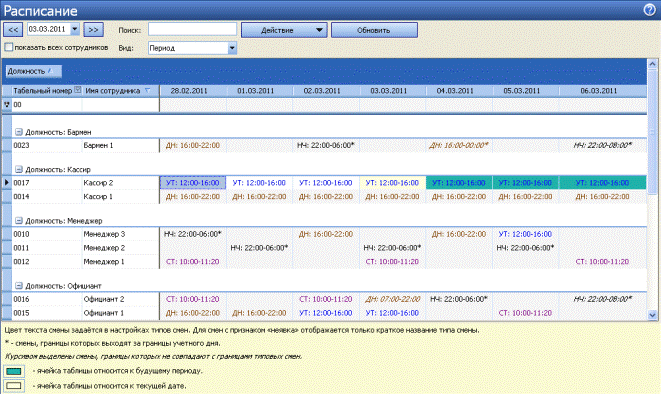 2. В полях Наименование и Краткое наименование введите соответственно полное наименование и буквенный код типа явки. Буквенный код отображается в табеле учета рабочего времени (в форме Т-13 в графах 4 и 6 обозначает код затрат рабочего времени). 3. В поле Коэффициент расчета к ставке введите величину процента, который будет использоваться для коррекции ставки сотрудника. 4. Выберите цвет, который будет использован для отображения информации по явкам данного типа в Журнале явки. 5. Статус может принимать значение – «Явка»/«Неявка». Для типа явки, обозначающего отработанное время, должен быть указан ненулевой коэффициент расчета к ставке, а статус должен иметь значение «Явка». Если тип явки должен обозначать неотработанное время (например, отпуск, больничный, командировку, прогул), то может быть задан коэффициент расчета к ставке (например, «0 %» для прогула, «80%» для больничного и т.п.) и удалена галочка в поле Статус (его значение изменится на «Неявка»). 6. При необходимости введите дополнительную информацию о типе явки (поле Комментарий) и нажмите кнопку Сохранить. Настройка расписания Настройка расписания производится в разделе Сотрудники → Расписание. Расписание представляет собой таблицу. По вертикали – список сотрудников (табельный номер, должность и имя сотрудника), по горизонтали – даты недели, на которую составляется расписание. В ячейках таблицы показываются назначенные сотрудникам смены.