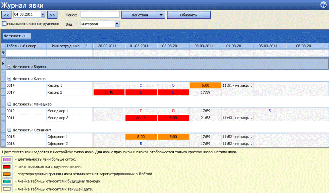 Журнал явки Контроль дисциплинированности персонала предприятия может быть произведен с помощью журнала явки, в котором содержится информация о времени прихода и ухода с работы (времени открытия и закрытия личной смены) всех сотрудников. Он вызывается с помощью пункта меню Сотрудники → Журнал явки.