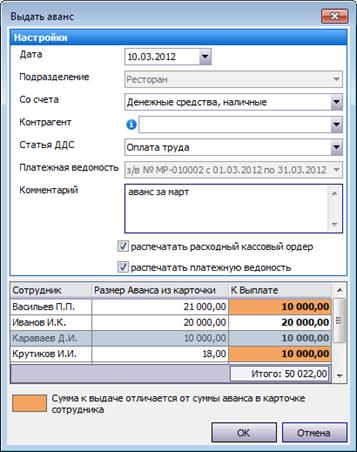 Зарегистрировать операцию выдачи аванса можно из Платежной ведомости, Сводного отчета по зарплате (для группы сотрудников), а также из Персонального отчета сотрудника. Выдать деньги из Платежной ведомости можно только после сохранения документа и присвоения ему номера. Для этого: 1. Откройте Платежную ведомость, выберите сотрудников, которым выдается аванс. 2. Нажмите кнопку Выдать аванс (или пункт контекстного меню). В открывшемся окне показан список сотрудников, которых Вы выбрали для выдачи аванса. Для каждого сотрудника показана сумма аванса из его карточки (из поля Аванс на закладке Оплата). К выплате может быть указана другая сумма, например, при частичной выплате аванса. Такие суммы выделены цветом. Если установлено нулевое значение, то проводка не регистрируется. Внизу списка показана итоговая сумма. 3. Укажите дату выполнения операции (по умолчанию установлена текущая дата). 4. В поле Подразделение показано название структурного подразделения, заданное для платежной ведомости. 5. Укажите счет, с которого будут выданы деньги. Если у счета обязателен контрагент, то его необходимо будет заполнить. 6. Для отражения денежного потока от данной операции в отчете укажите статью движения денежных средств (статью ДДС). 7. В поле Платежная ведомость показан номер данной платежной ведомости. 8. При необходимости напишите дополнительную информацию о данной операции в поле Комментарий. 9. Если необходимо по данной операции распечатать расходный кассовый ордер и (или) платежную ведомость, установите соответствующие галочки. При сохранении данной операции для каждого документа будет открыто окно для предварительного просмотра, из которого документ может быть распечатан или экспортирован в формат MS Excel. 10. Нажмите кнопку ОК. Если вы ошиблись при отборе сотрудников, то нажмите кнопку Отмена, и сформируйте список заново. 11. После выполнения операции для каждого сотрудника будет зарегистрирована проводка по начислению денежных средств: Дебет (Текущие расчеты с сотрудниками) / Кредит (счет, заданный при выдаче) на сумму выплат, проводка с типом АВАНС.