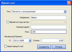 2. Выберите из списка один из предопределенных типов счета, на основании которого новый счет будет отнесен к одной из групп. 3. В поле Название задайте название счета, отражающее его назначение. 4. Если счет является подсчетом одного из счетов, поставьте галочку в поле Является подсчетом и выберите его из списка. 5. Введите код счета в системе и, если по нему ведется баланс, то в поле Сумма укажите величину его начального баланса. 6. После задания всех параметров нажмите кнопку Сохранить. Date: 2015-05-22; view: 996; Нарушение авторских прав |