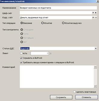 Для регистрации движения денежных средств в Плане счетов, необходимо настроить в системе возможные типы таких операций. Чтобы настроить типовую операцию внесения/изъятия, выполните следующее: 1. Выберите в меню Розничные продажи пункт Типы внесений / изъятий. 2. Для заведения нового типа нажмите кнопку Добавить. 3. Задайте тип операции («внесение», «изъятие») и введите ее наименование, отражающее ее суть. 4. Поле Шеф-счет можно не заполнять. 5. В поле Корр.счет выберите из списка название счета, на котором будут учитываться внесенные / изъятые суммы.. 6. В поле Статья ДДС укажите статью движения денежных средств для данной типовой операции. 7. Вы можете установить ограничение на размер вносимой или изымаемой суммы. 8. Если Вы предполагаете регистрировать данную операцию внесения/изъятия денежных средств только в BackOffice, то галочка Скрывать в iikoFront должна быть установлена. 10. После задания всех параметров нажмите кнопку Сохранить.