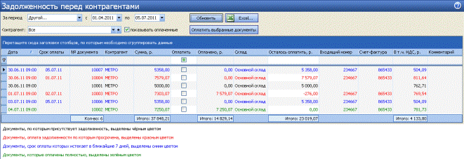 В данном окне вы видите сумму, которая была изъята при закрытии кассовой смены. В блоке Списать вы можете ввести размер фактической суммы, которую менеджер сдал в сейф. Непосредственно в этом окне данная сумма может быть переведена на необходимый счет. После проверки всех операций нажмите кнопку Далее. 4. Шаг 3. На последнем шаге Вы должны проверить операции внесения наличных. При этом также может быть изменены контрагент и счет, на который будут зачислены деньги. Подтвердите корректность операций и нажмите кнопку Сохранить и закрыть. Задолженность перед контрагентами В случае если при создании накладной указывается ответственный сотрудник предприятия (в поле «Зачесть сотруднику»), то это означает, что данный сотрудник рассчитался с поставщиком за поставленный товар. Если же с поставщиками расчет ведется не «по факту», стоимость поставленных товаров по накладным накапливается на счете «Задолженность перед поставщиками» и факт их оплаты должен быть зарегистрирован в системе. Для регистрации оплаты накладных предоставляется специальный инструмент, который открывается при выборе пункта меню Финансы → Задолженность перед контрагентами. Цвет накладной сигнализирует о наличии задолженности. Неоплаченные документы показаны разными цветами: по которым есть задолженность – черным, истек срок оплаты – красным, истекает в ближайшие семь дней – синим. При установленной галочке оплаченные накладные зеленым будут также показаны данные по полностью оплаченным документам.