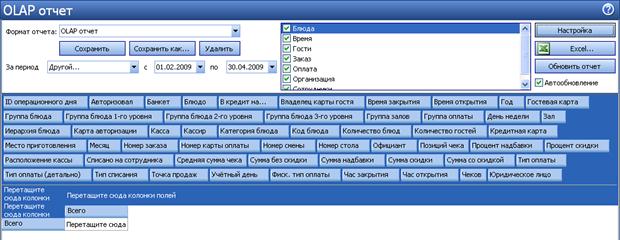 OLAP-отчет отличается от обычного тем, что Вы сами определяете те параметры, по которым хотите получить информацию. В системе iiko такие отчеты могут быть построены для анализа любых данных. Например, о суммах выручки, пользующихся популярностью блюдах, эффективности работы официантов, расходе товаров и т. д. В системе существует два вида OLAP-отчетов: для анализа любой информации, проходящей по пробитым чекам – OLAP Отчет по продажам, и для анализа информации по зарегистрированным проводкам – OLAP Отчет по проводкам. Например, в отчете о продажах можно посмотреть информацию о количестве реализованных блюд и количестве гостей, покупавших их каждый день, но для того чтобы посмотреть как списывались ингредиенты проданных блюд, необходимо использовать Отчет по проводкам. Это связано с тем, что для системы продажа – это, помимо полученных от гостя денег, списание со склада товаров, являющихся ингредиентами блюд. Каждое такое списание – это отдельная проводка. Данные отчеты расположены в пункте меню Отчеты. OLAP Отчет по продажам также может быть построен из списка кассовых смен (в пункте меню Розничные продажи → Кассовые смены необходимо отметить галочками интересующие смены, нажать кнопку Действия и выбрать пункт Создать новый OLAP-отчет).