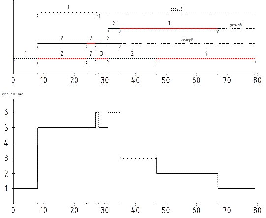Рис. 5. Линейная диаграмма и график движения рабочей силы Посчитаем коэффициент заполнения для графика движения рабочей силы, он должен стремиться к единице, если оптимально распределен человеческий ресурс и грамотно спланирован график выполнения работ: