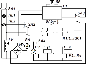 Рисунок 5.1 – Cхема для дослідження електромагнітних реле автоматики Вимикач SA1 підключає джерело змінної напруги до схеми дослідження. Лампочка HL1 сигналізує про наявність живлення схеми. лабораторним автотрансформатором TV регулюють величину напруги, яка подається на обмотки реле після випрямлення діодним мостом VD. Перемикачі SА2 та SА3 здійснюють комутації у схемі, які дозволяють виконувати виміри напруги і струмів, а також часу спрацювання і відпускання реле, встановлених на стенді. Перемикач SА2 у положенні 1 підключає контакти К1:1 – К8:1 реле К1 – К8 до сигнальної лампу НL2 – для визначення напруги і струмів спрацьовування і відпускання, які контролюються відповідно вольтметром РV та амперметром РА, у положенні 2 зазначені контакти підключаються до електронного мілісекундоміру РТ – для визначення часу спрацювання і відпускання відповідних реле. За допомогою перемикача SА4 в схему підключається обмотка одного з семи реле, встановлених на стенді. Перемикач SА5 здійснює комутації в схемі мілісекундоміру таким чином, що у положенні 1 визначається час спрацювання (власний час замикання), а в положенні 2 – час відпускання (власний час розімкнення). при визначенні часу спрацьовування мілісекундомір РТ запускається при переведенні перемикача SA3 з положення 2 у положення 1 і зупиняється при замиканні контактів відповідного реле. при визначенні часу відпускання мілісекундомір РТ запускається при переведенні перемикача SA3 з положення 1 у положення 2 і зупиняється при розімкненні контактів. Скидання інформації з табло секундоміра здійснюється за допомогою кнопкового вимикача SВ. 2. визначення величин напруги і струмів спрацьовування (U c, I c) і відпускання (U в, I в) реле виконують у такій послідовності: 16) рукоятку перемикача SA4 встановлюють у положення 1 (до схеми підключається реле К1); 17) рукоятку автотрансформатора TV обертають проти годинникової стрілки до упору; 18) рукоятку перемикача SA2 встановлюють у положення 1; 19) рукоятку перемикача SA3 встановлюють у положення 1; 20) рукоятку перемикача SA5 встановлюють у положення 1; 21) рукоятку вимикача SA1 встановлюють у верхнє положення – “включено”; 22) рукоятку лабораторного автотрансформатора TV повільно обертають за годинниковою стрілкою, контролюючи напругу U вольтметром РV та струм I амперметром Ра, аж до спрацьовування реле К1 (момент спрацьовування фіксується по запалюванню сигнальної лампи НL2); результати вимірів напруги U с та струму I с спрацьовування записують до таблиці 5.1; 23) рукоятку лабораторного автотрансформатора TV повільно обертають проти годинникової стрілки, контролюючи напругу U вольтметром РV та струм I амперметром Ра, аж до відключення реле (момент відключення фіксується по згасненню сигнальної лампи НL2); результати вимірів напруги U в та струму I в відключення записують до таблиці 5.1 Дії за пунктами 2) – 8) повторюють три рази, записуючи результати вимірів до таблиці 5.1. За визначеними даними розраховують середні значення. Далі, переключаючи рукоятку перемикача SA4 у положення 2, …, 7, повторюють дії за пунктами 2) – 8), визначаючи параметри реле К2, …, К7. За результатами дослідів розраховують значення коефіцієнта повертання реле
