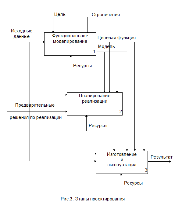 Рассмотрим возможный вариант декомпозиции блока “функциональное моделирование” (рис.4) в виде трех последовательных этапов: формирование целевых функций, формирование системы требований и планирование функций.
